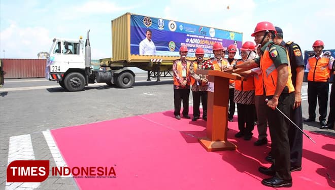 TIMES Natuna/Gubernur Jawa Timur. Dra. Hj. Khofifah Indar Parawansa saat melepas ekspor komoditi pertanian di Terminal PetikEmas Surabaya (TPS). Kamis (21/3/2019). (FOTO: TIM Media For TIMES Indonesia)