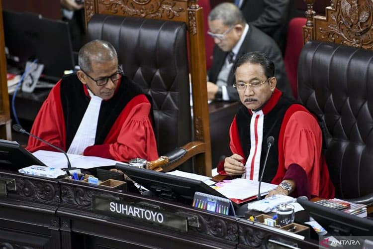 TIMES Natuna/Ketua Mahkamah Konstitusi (MK) Suhartoyo (kanan) bersama Wakil Ketua MK Saldi Isra memimpin sidang pengucapan putusan perkara dilanjutkan atau tidak (dismissal) sengketa Pilkada 2024 di Gedung Mahkamah Konstitusi, Jakarta, Rabu (5/2/2025). (ANTARA)